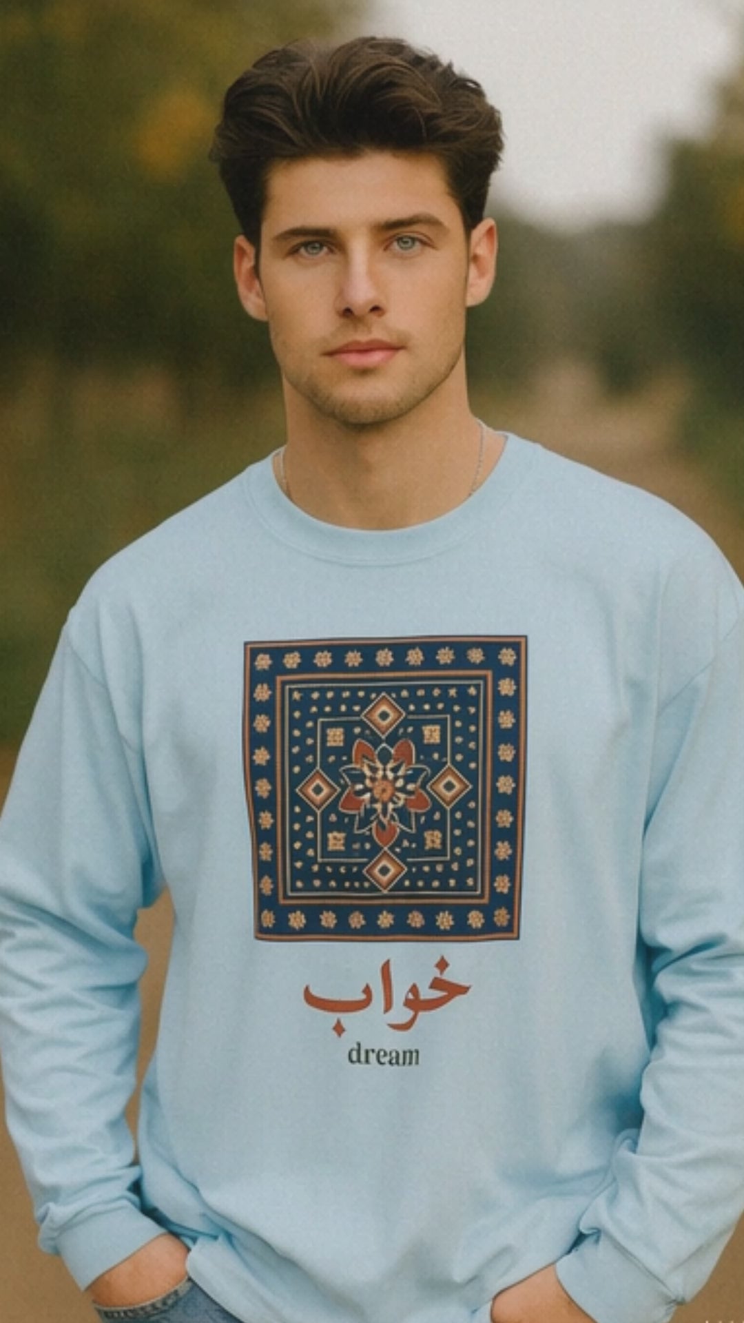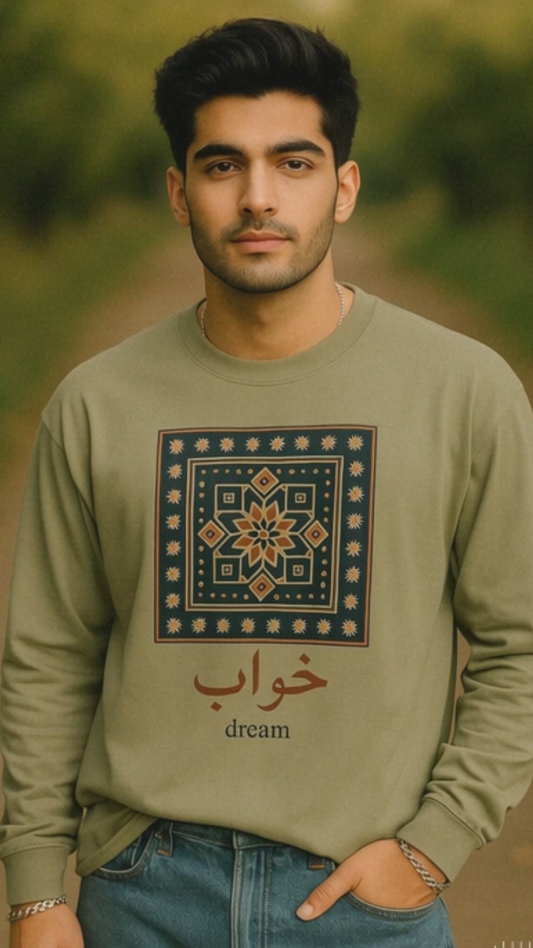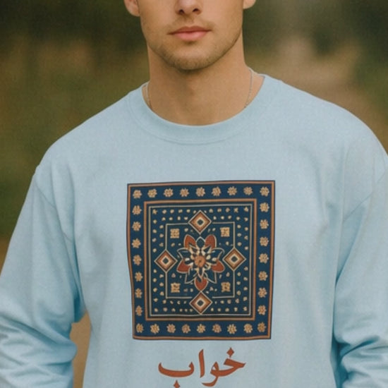 This long sleeve shirt showcases the word “Khwab” (خواب), meaning dream, in graceful Urdu/Arabic calligraphy, paired with a modern tile-inspired design. The pattern takes cues from South Asian and Middle Eastern decorative art while keeping a clean, contemporary feel.