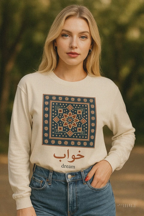 Dream Calligraphy Shirt – Arabic Aesthetic Long Sleeve – Modern Minimal Tile Art Graphic Tee – Cultural Unisex Top – Artsy Gift Idea