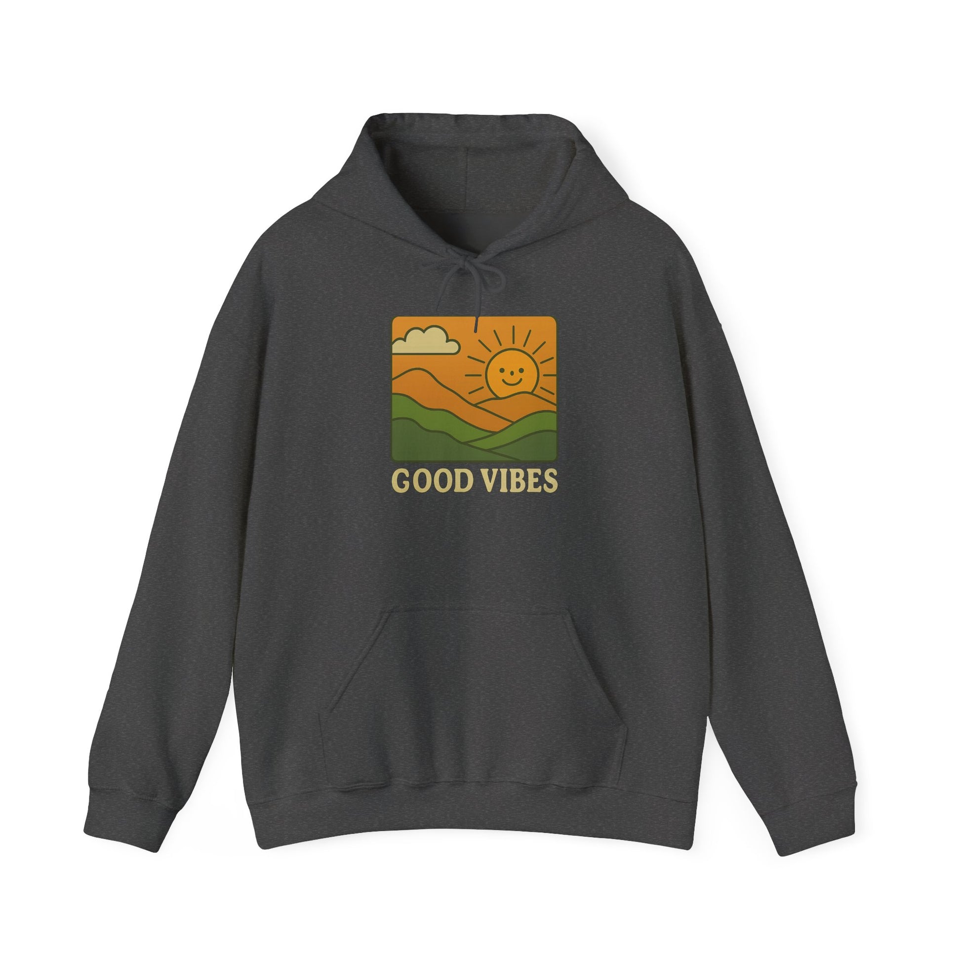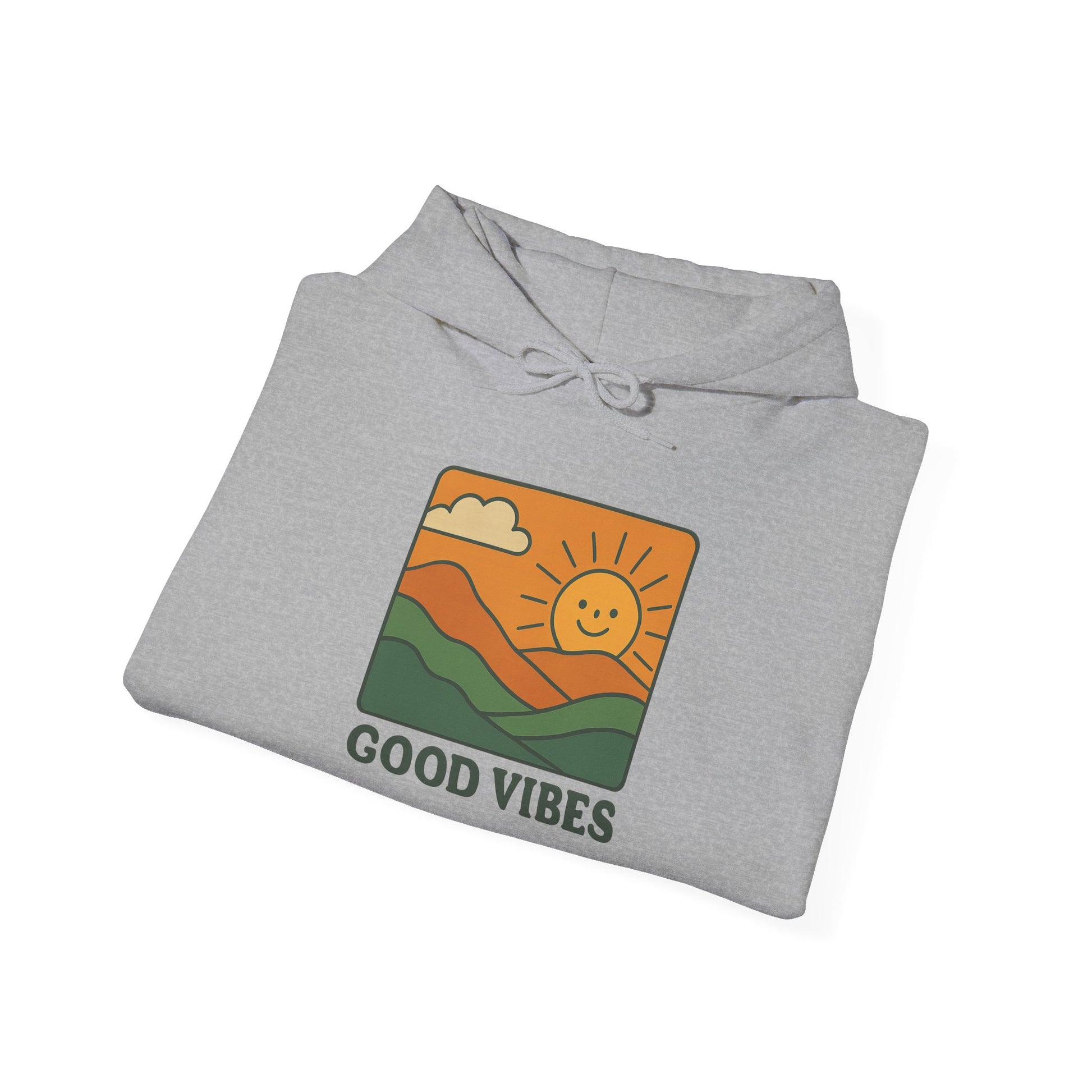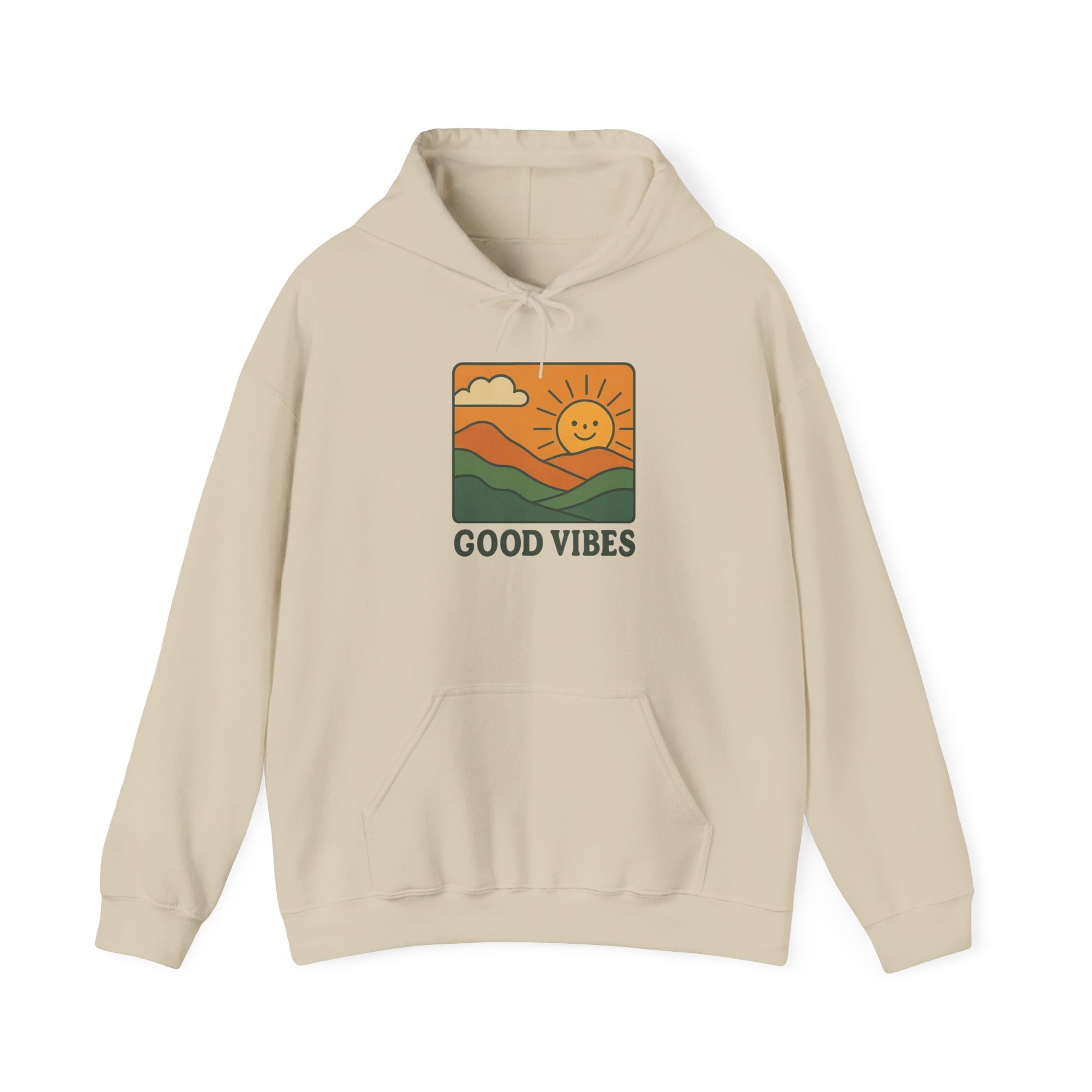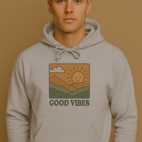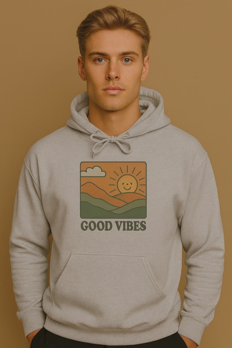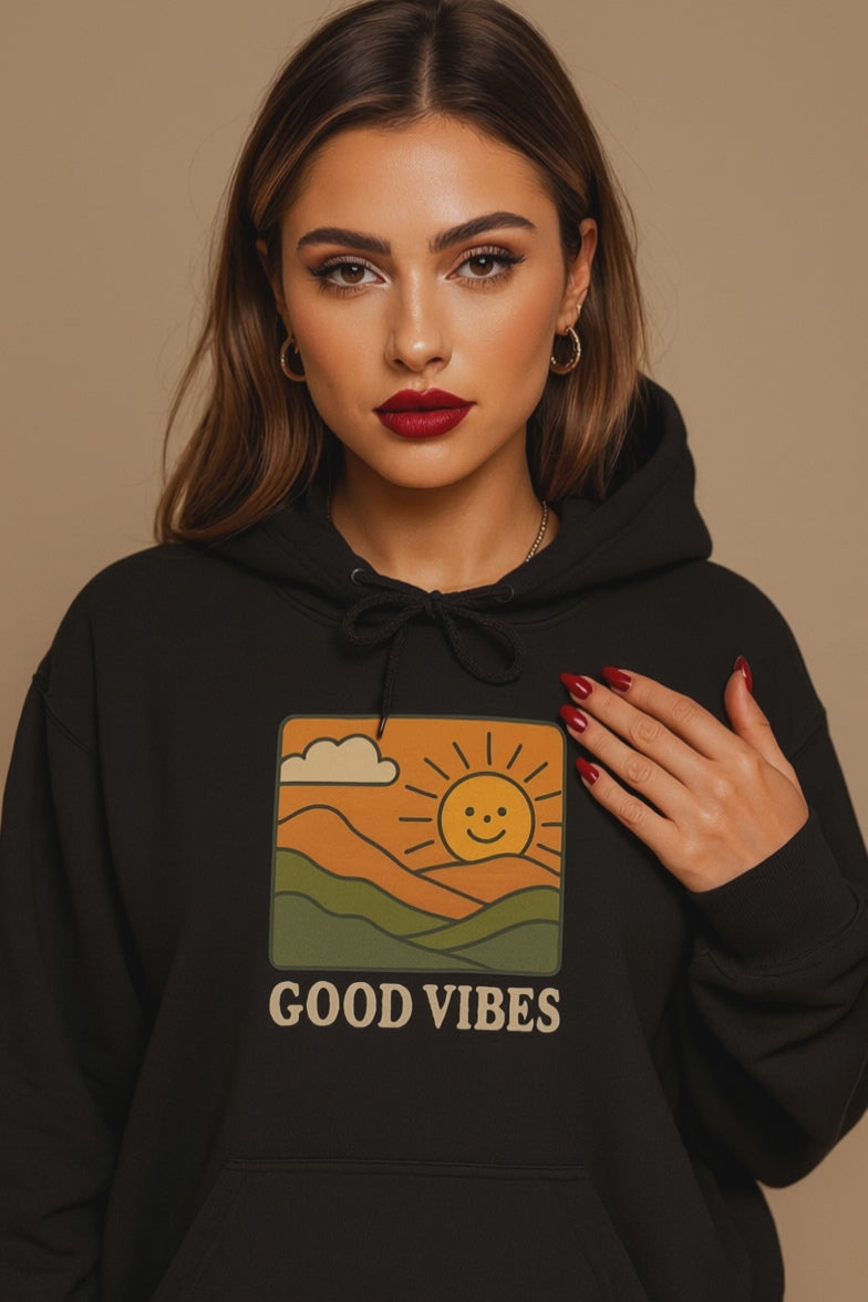Bring positivity to your style with our Good Vibes Retro Hoodie, designed for anyone who loves cozy comfort and timeless streetwear. This unisex oversized hoodie features a bold, vintage-inspired graphic of a smiling sun rising over rolling hills with the words Good Vibes — perfect for spreading positivity wherever you go.
