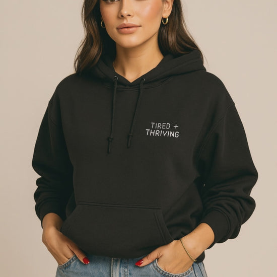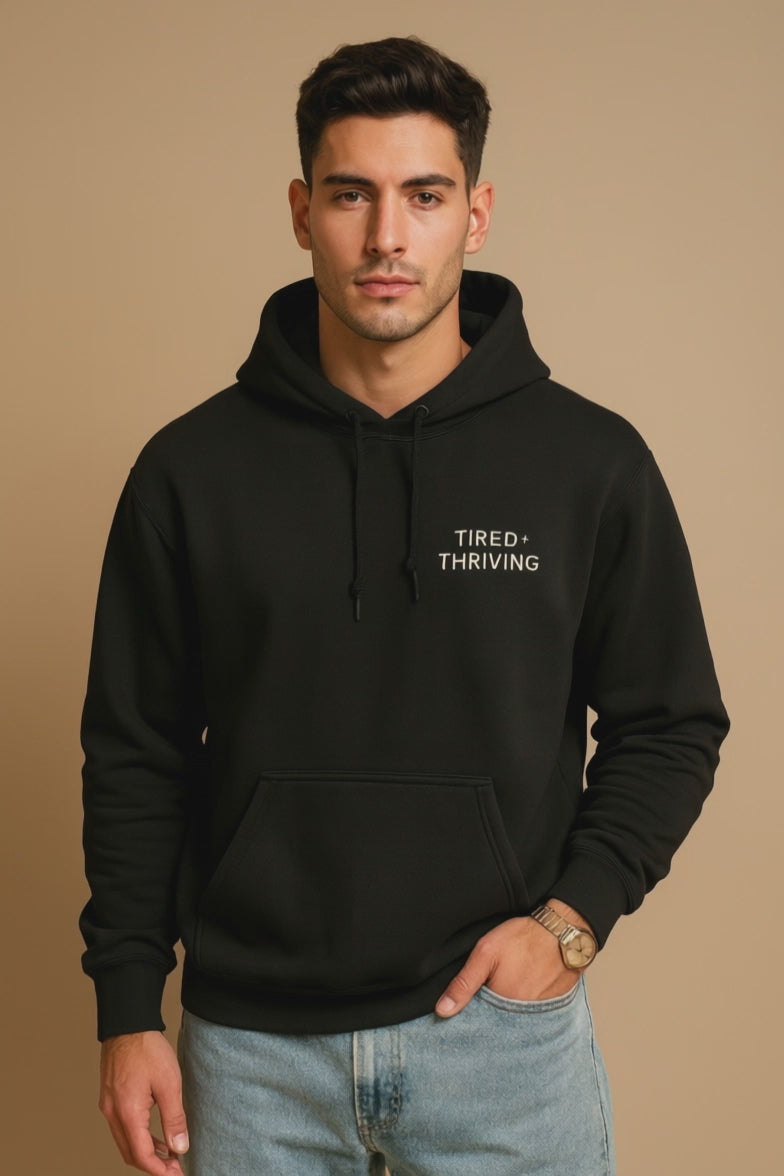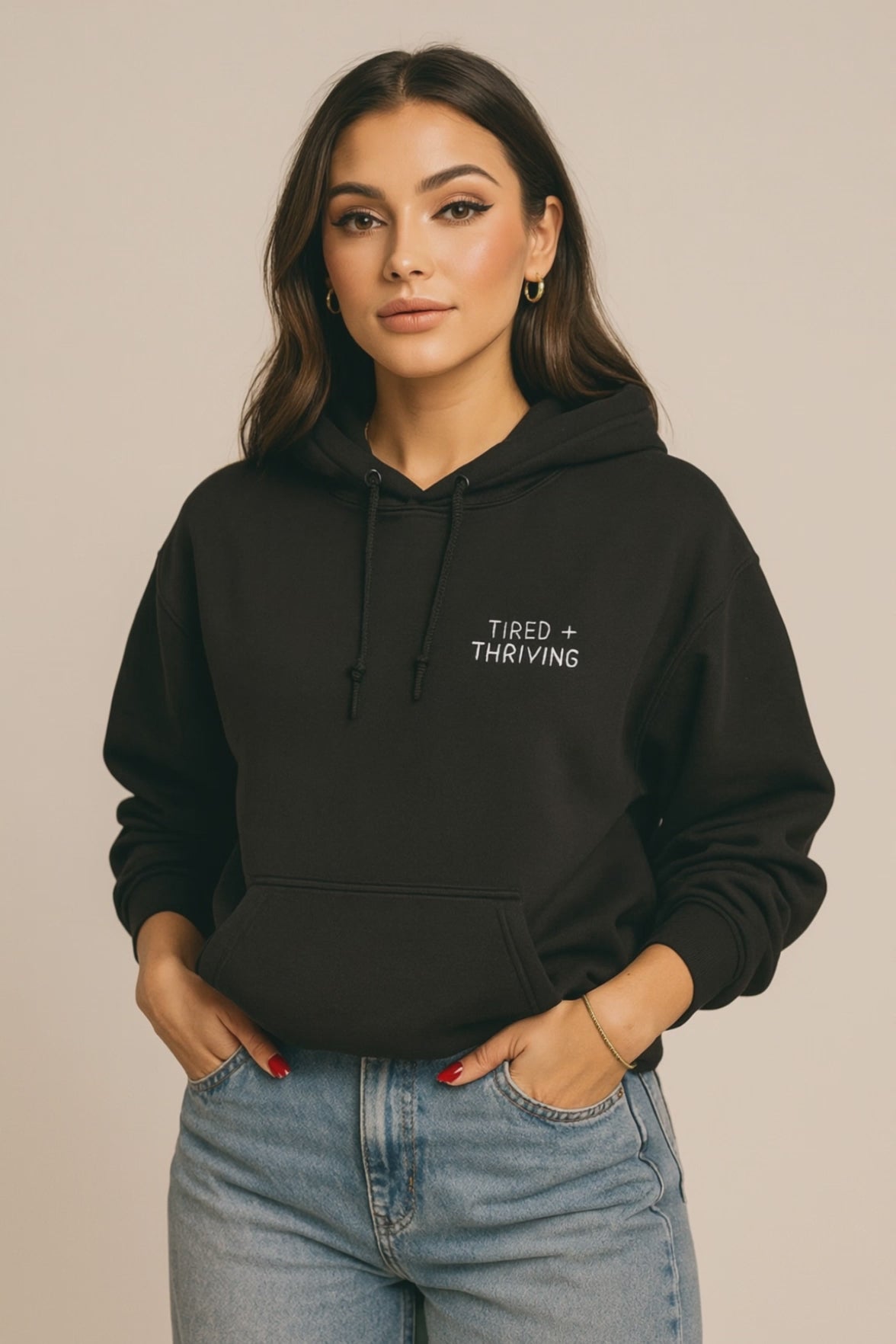 Minimal “Tired + Thriving” Embodied hoodie. Cozy fleece, unisex fit, durable chest graphic—everyday streetwear for busy days that still thrive.